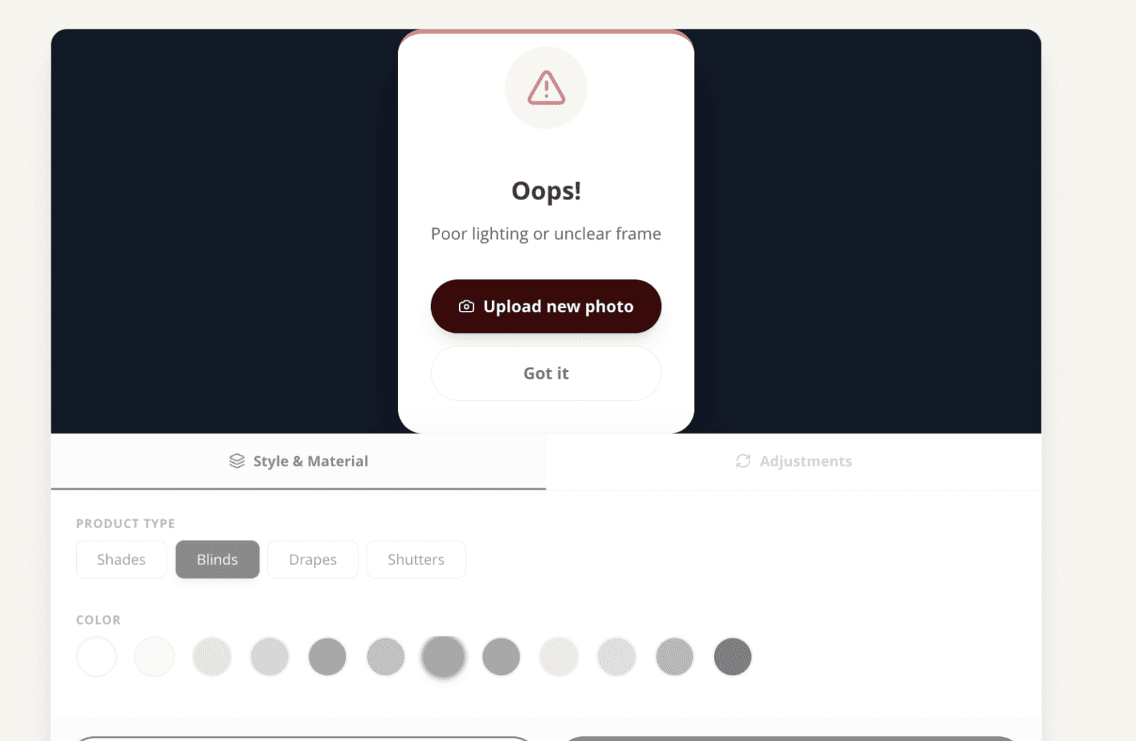 The system now shows clear validation messages when users upload photos with no windows visible or poor lighting conditions. This prevents bad AI outputs by catching these issues upfront and guides users to upload better photos for accurate blind visualization.