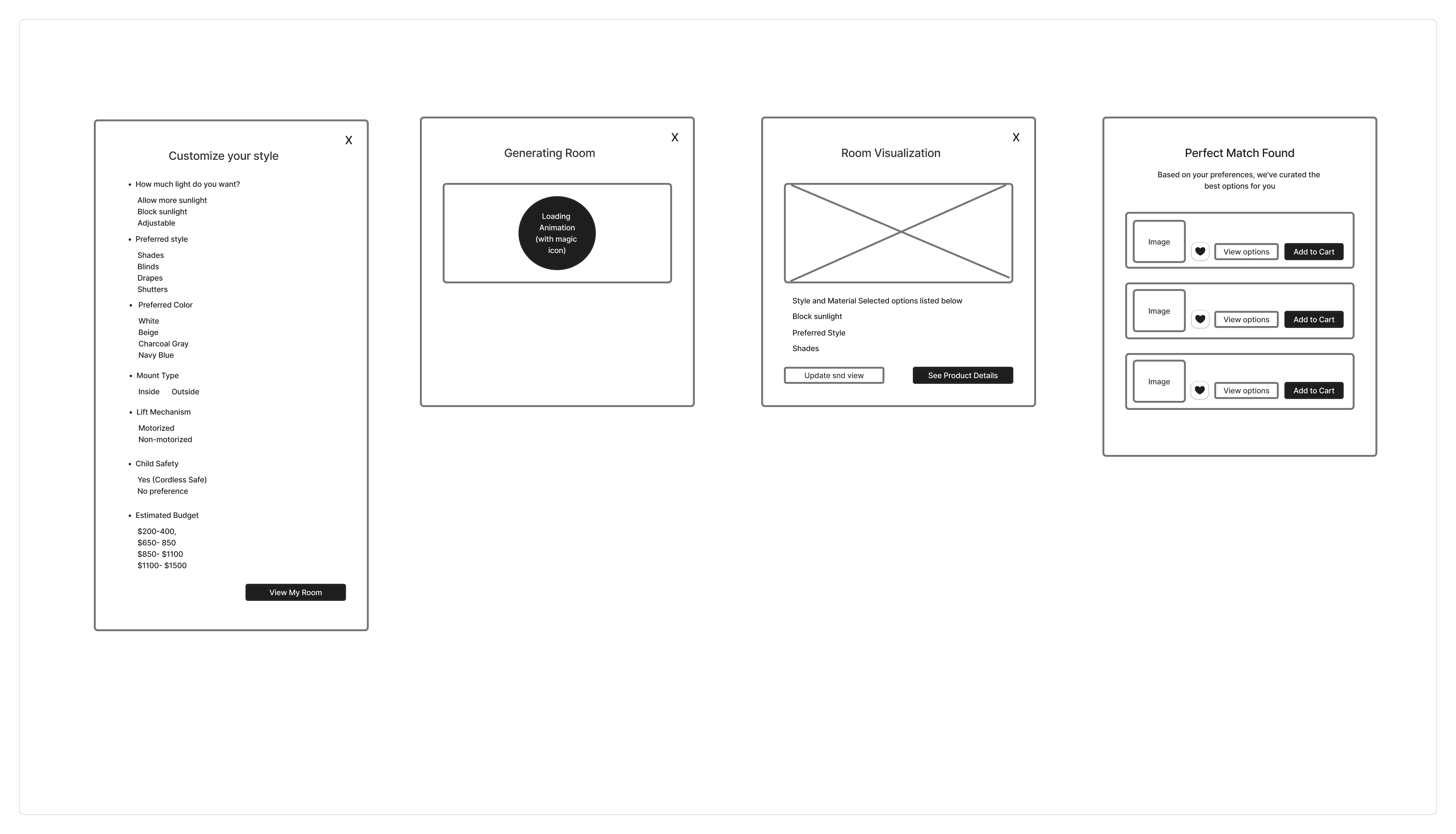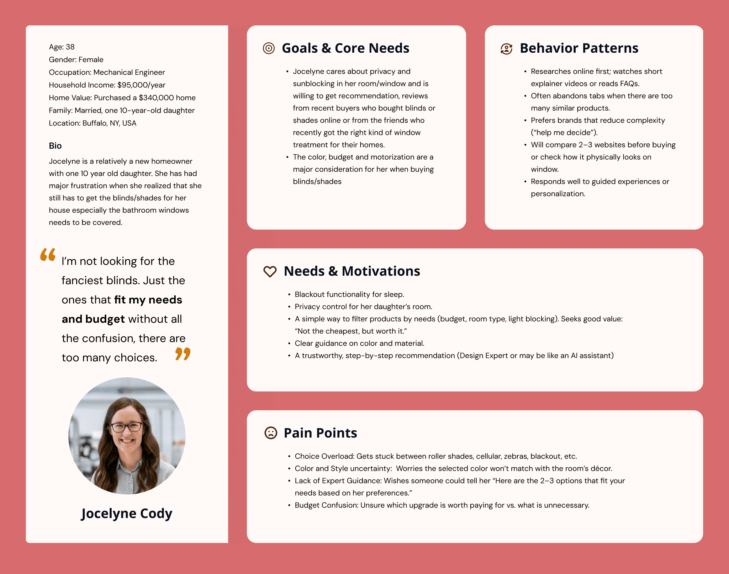 Buying custom blinds online is a high‑stakes decision that most users make with low confidence. Many shoppers struggle to imagine how a specific fabric, color, or light‑filtering option will look in their actual room, leading to decision fatigue, cart abandonment, or overreliance on free samples and support channels which contributes to high abandonment rates.