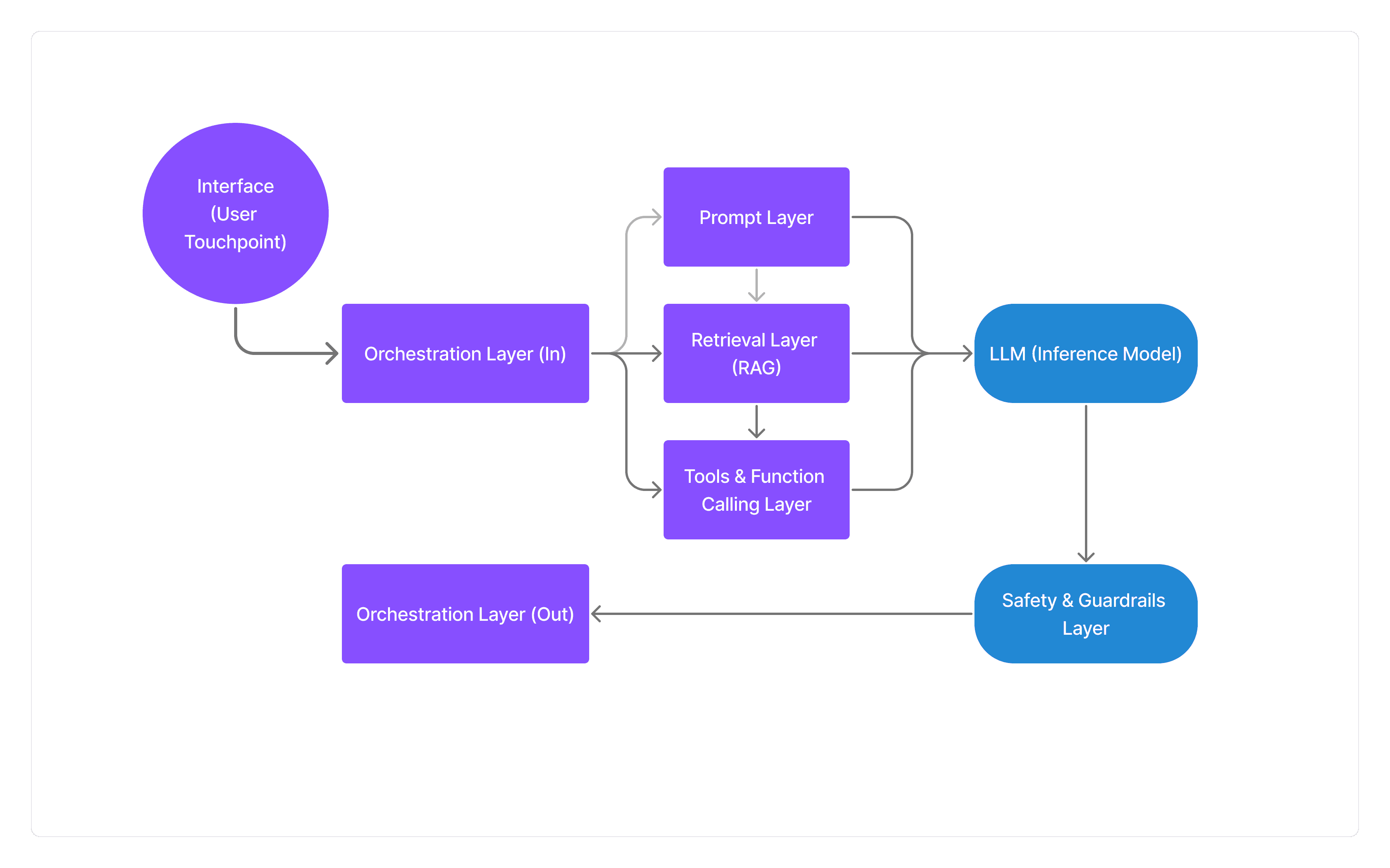 The core intelligence resides in the LLM Inference Model, which reasons over retrieved data to generate personalized product recommendations, trade-off comparisons, and human-readable explanations of its logic—while explicitly avoiding unsafe actions like window measurements or personal inferences—supported by Tools & Function Calling for image analysis, product scoring, and visualization rendering, and fortified by a Safety & Guardrails Layer that enforces disclaimers, blocks unsupported claims, and handles edge cases with clear error messaging or human consultant referrals.