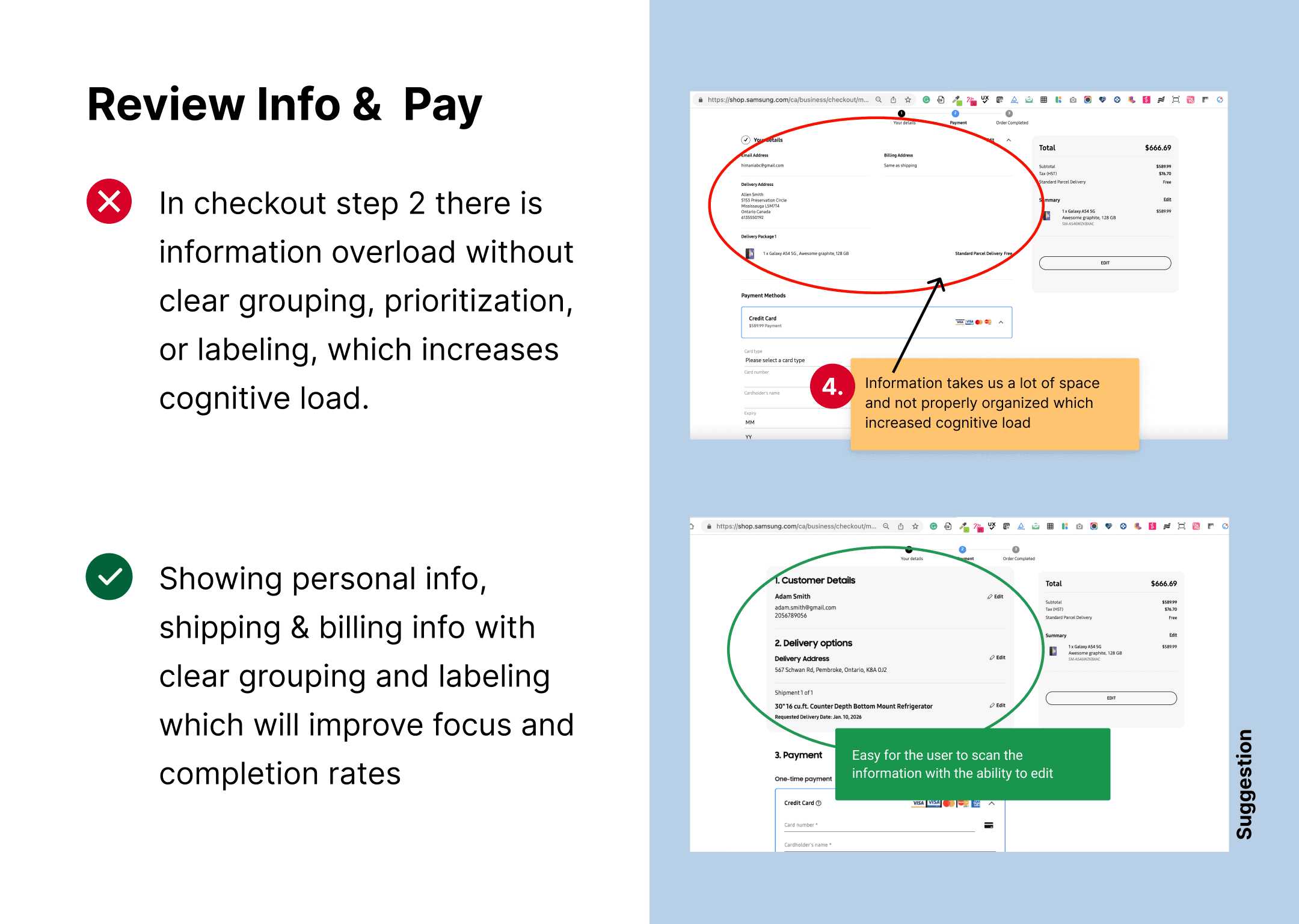 Too much information is displayed on the left in checkout step without clear grouping, prioritization, or labeling, which increases cognitive load. Structuring content into concise sections (Personal info, Shipping, Billing) and reducing non‑essential elements would improve focus and completion rates.